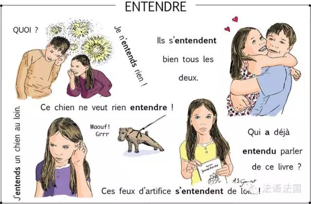 v.t. | v.i. | v.pr 『 查看变位 』 v.t. 1、听见,听到 2、倾听,听取 3、听说:entendre parler 听说 4、听懂,领会 6、想说,想指 7、打算,有念头,想:entendre + inf.,entendre + que + sub. 打算做... 8、了解,精通,熟悉 v.i. 赞同,同意:entendre à 赞同 v.pr 1、被听见 2、被理解,被领会:se faire entendre 被理解 3、精通,擅长:s'entendre à faire qch. 擅长做... 4、懂得自己的意思,明白自己的意思 5、互相听见,会想理解,彼此商量统一意见 ⊙ 词组 1、ne rien entendre à 对...一窍不通 2、s'entendre avec qn. 和某人相处融洽 3、à l'entendre 按他的说法 4、donner à entendre 暗示,示意 5、entendre raison 讲理,相互了解 6、sous-entendre 意味着,意思是 7、ne pas entendre malice à une chose 在做某事中不怀好意 ⊙ 例句 1、Cela s'entend. 这很明显。这是不言而喻的。 2、Je n'entends rien. 我什么都没听见。 3、Entendez-vous, dans nos campagnes, le cri de nos agriculteurs ? 你听见了?乡村农民的尖叫声? 4、Une explosion se fait entendre. 响起了一声爆炸。 5、Il entend mal. 他听觉不灵敏。 6、J'entends un chien au loin. 我听见了远处的狗吠。 7、Ils s'entendent bien tous les deux. 他们互相理解对方。 8、Qui a déjà entendu parler de ce livre? 谁已经听说了这本书? |
